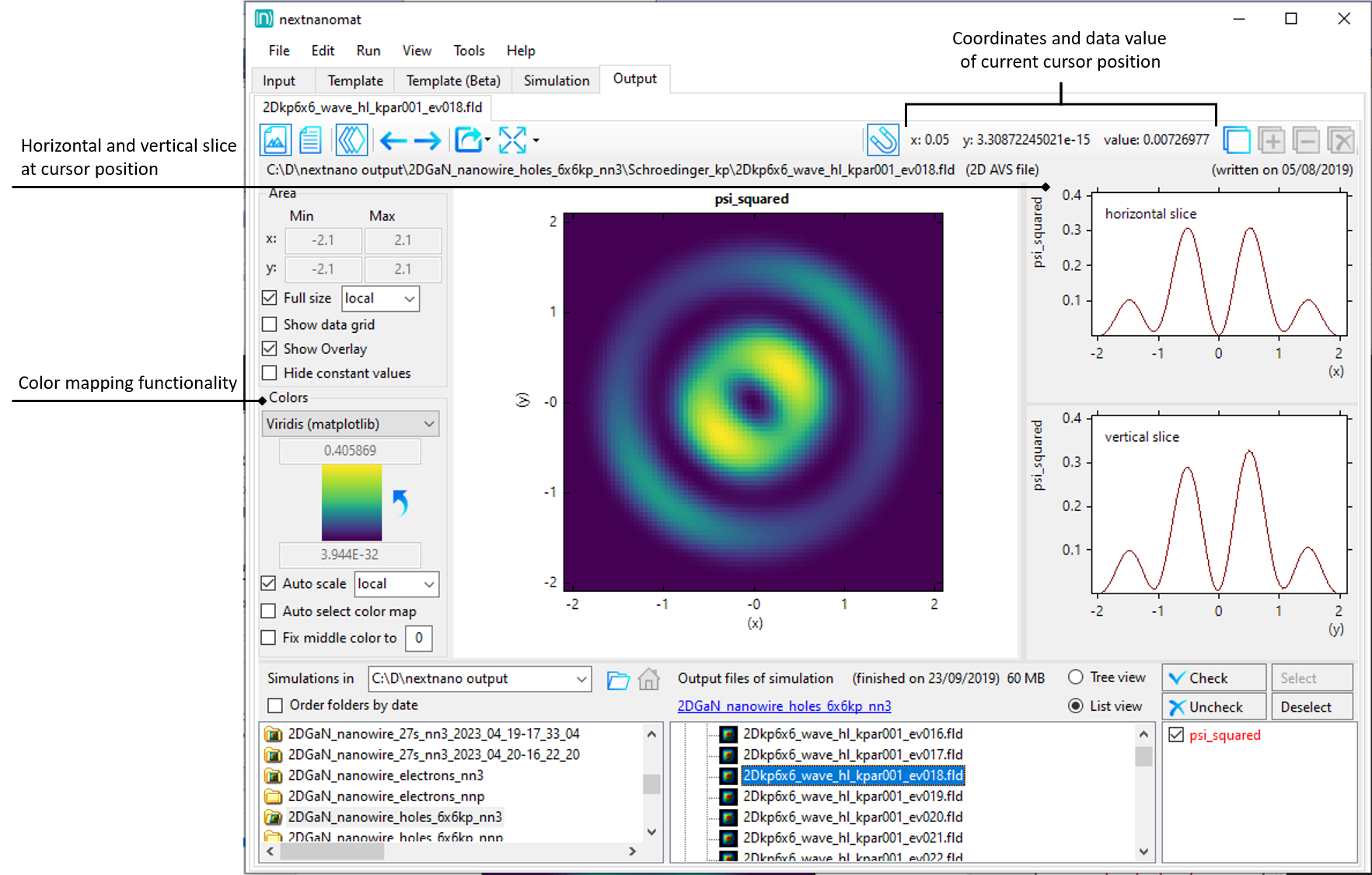 Real three-dimensional plots are not supported by nextnanomat. Instead 2D planes of the 3D data are visualized through heat maps, same as for 2D data. An additional panel allows the selection of the displayed plane (xy, xz or yz) and the position of the slice. This panel can be seen in Figure 1.1.31. If three-dimensional visualization is aimed for, we recommend exporting data to ParaView.