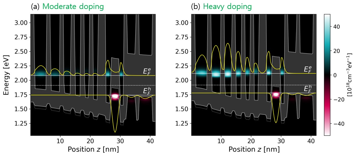 Figure 3.4.14 Energy-resolved electron and hole densities for the (a) reference and (b) optimally-doped structures at the potential drop per period of 340 mV (colormap). Yellow curves indicate the electron and hole densities integrated above and below the border energy (dashed line). They have been scaled by a common factor for both (a) and (b).