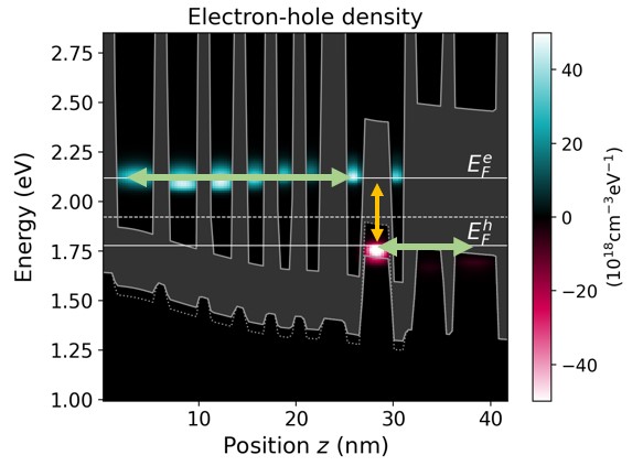 Figure 3.4.13 Band edge profile (grey lines), local density of states (colormap), quasi-Fermi levels (white solid lines) and the energy border for distinguishing electrons and holes (white dashed line). The heavy-hole band edge (dotted) is beyond the light-hole (solid) in the \(\mathrm{Ga}_{0.65}\mathrm{In}_{0.35}\mathrm{Sb}\) hole well.