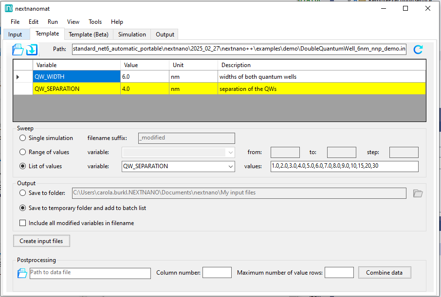 In the Template tab you can overview all variables which are defined in the input file. You can sweep a chosen variable by a list of values or a range of values. Additionally, there is the option to compare the sweep results by the post-processing feature: It collects specified data from sweep files and stores them in a separate file, so that e.g. interband transition energy can be visualized as a function of well width.