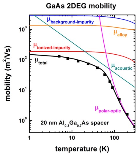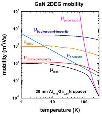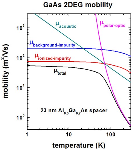 The following figure shows the calculated 2DEG mobility as a function of temperature.