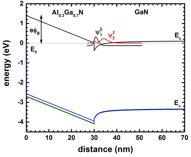 • 5 nm cap,     30 nm Al0.3Ga0.7N barrier. The calculated 2DEG density is n = 1.03 * 1013 cm-2 (n = 1.20 * 1013 cm-2 [Jogai2003]).