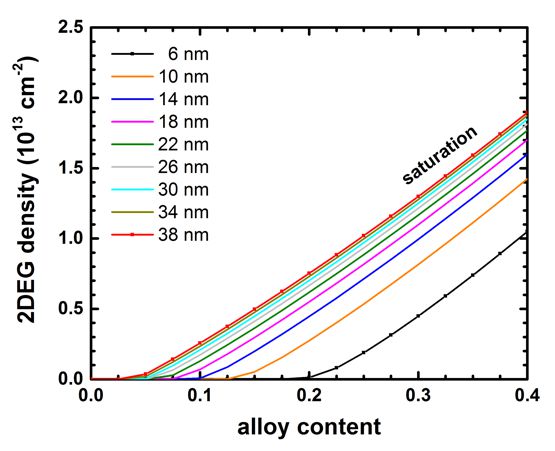 For a given barrier thickness, the 2DEG sheet carrier concentration varies almost linearly with alloy concentration x.