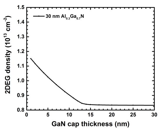 The following figure shows the 2DEG density vs. GaN cap layer thickness for a 30 nm Al0.3Ga0.7N barrier.