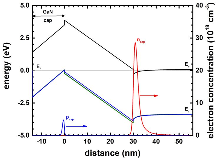 The following figure shows the band edges and the electron and hole densities for a 14 nm GaN cap layer.