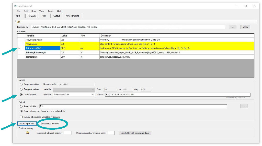 We use nextnanomat's Template feature in order to sweep over the AlxGa1-xN barrier thickness. This is shown in the following screenshot.