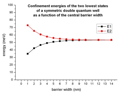 • Here, we varied the thickness (from 1 nm to 14 nm) of the Al0.2Ga0.8As barrier layer that separates the two quantum wells and calculated the energies of the two lowest eigenstates. The width of the quantum wells is fixed (6 nm).