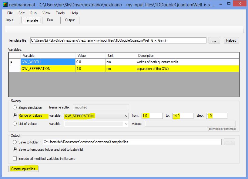 Go to "Template", open input file, select "Range of values", select "QW_SEPARATION", click on "Create input files", go to "Run and start your simulations.