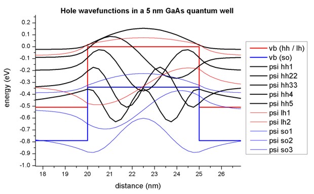 The 5 heavy hole wave functions are indicated in black, the 2 light hole
