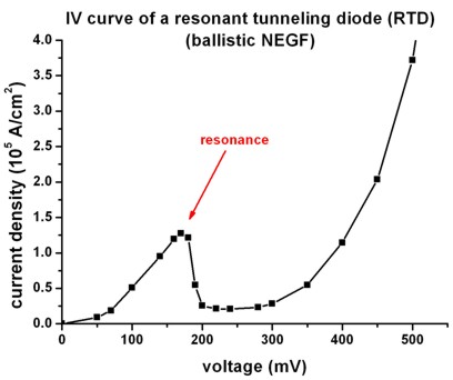 The following figure shows the IV characteristics of the resonant tunneling diode.