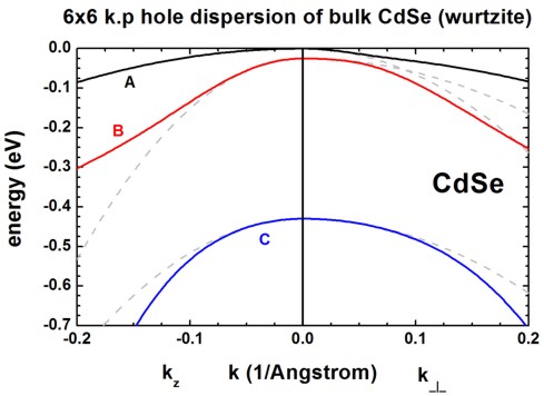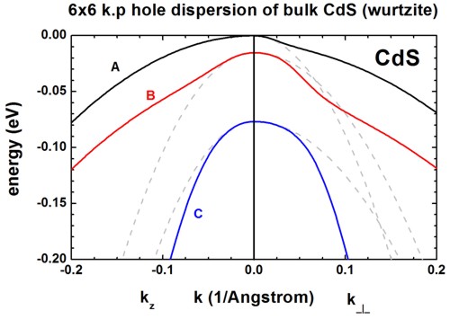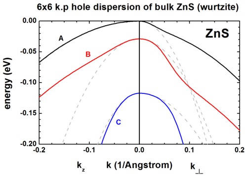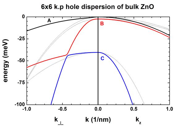 The following figure shows the bulk 6-band k.p energy dispersion for ZnO.